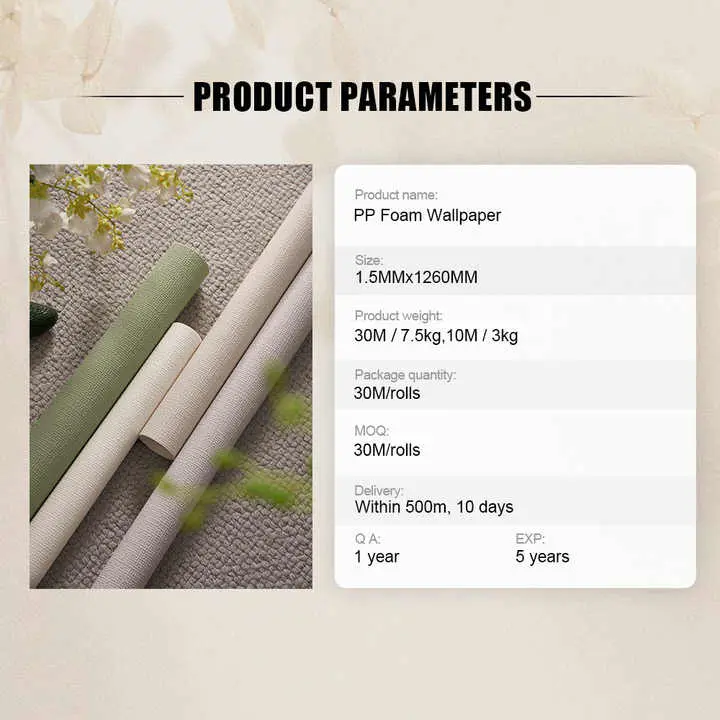 · חומר עמיד ועמיד בפני מים: טפטים לקצף PP שלנו מיוצר מחומר פוליפרופילן באיכות גבוהה, ומבטיח שהוא יישאר אגן לחות, אטום למים ועמיד בפני עובש וחום, מה שהופך אותו למושלם לשימוש בסביבות שונות, כולל חללי בית, מסחר ומינהל.